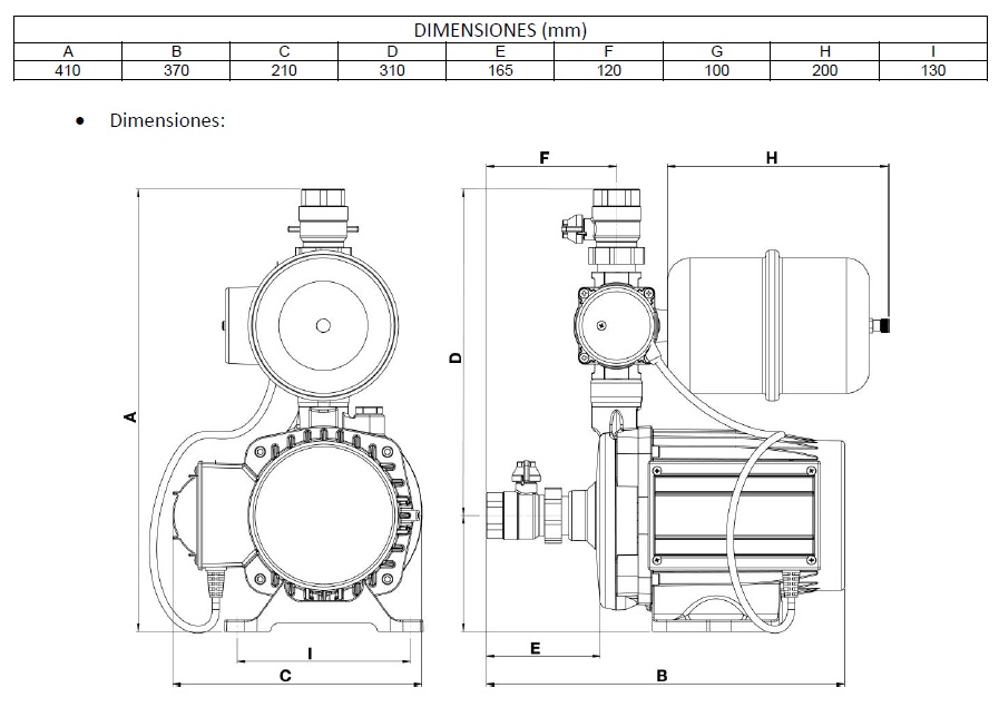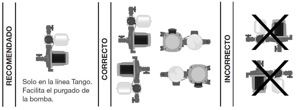 El presurizador deberá ser instalado obligatoriamente de modo que el eje de la electrobomba permanezca en posición horizontal, de acuerdo a las siguientes figuras. El no cumplimiento de esta norma implicará el desgaste irregular del equipo y la consecuente pérdida de la garantía.
