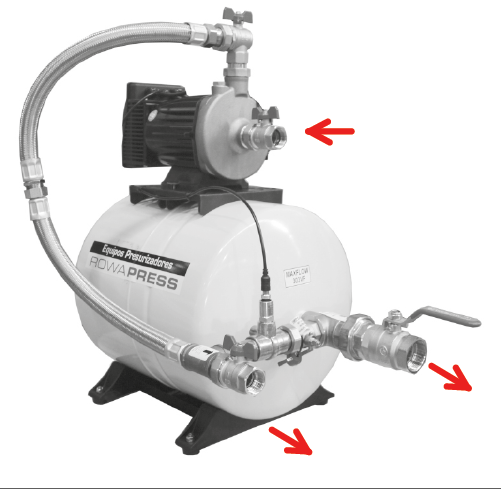 El presurizador deberá ser instalado obligatoriamente de modo que el eje de la electrobomba permanezca en posición horizontal, de acuerdo a las siguientes figuras. El no cumplimiento de esta norma implicará el desgaste irregular del equipo y la consecuente pérdida de la garantía.