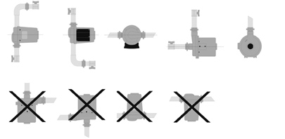 El presurizador deberá ser instalado obligatoriamente de modo que el eje de la electrobomba permanezca en posición horizontal, de acuerdo a las siguientes figuras. El no cumplimiento de esta norma implicará el desgaste irregular del equipo y la consecuente pérdida de la garantía.