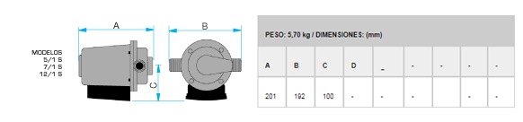 Peso: 5,70 kg. / Dimensiones (mm).